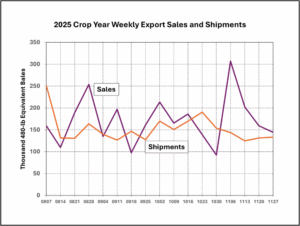 - US exports for the 2025 crop marketing year were unchanged from the November estimate at 12.2 million bales.