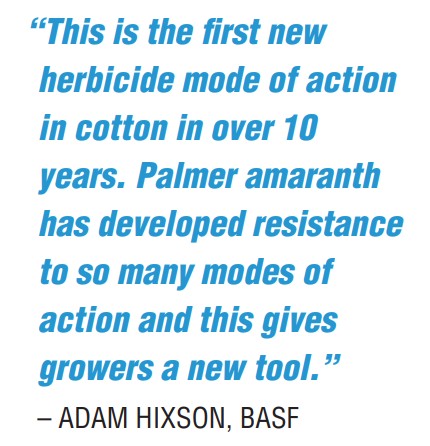 “This is the first new herbicide mode of action in cotton in over 10 years,” says Adam Hixson, Technical Service Rep at BASF. “Palmer amaranth has developed resistance to so many modes of action and this gives growers a new tool.”